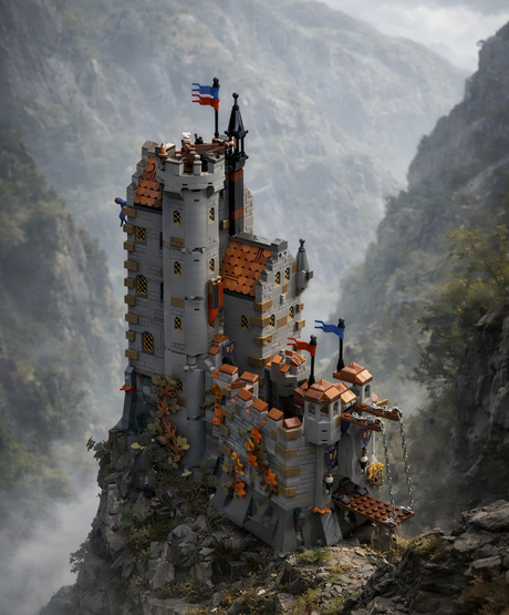Sir Perceval built a castle with about 113,000 parts, standing on 28 32x32 baseplates. The castle was designed to be completely modular. It consists of 28 baseplate modules (A1 - G4) and 23 building modules (H01-H23). Each building is built separately and all floors are modularly removable and also have an interior.