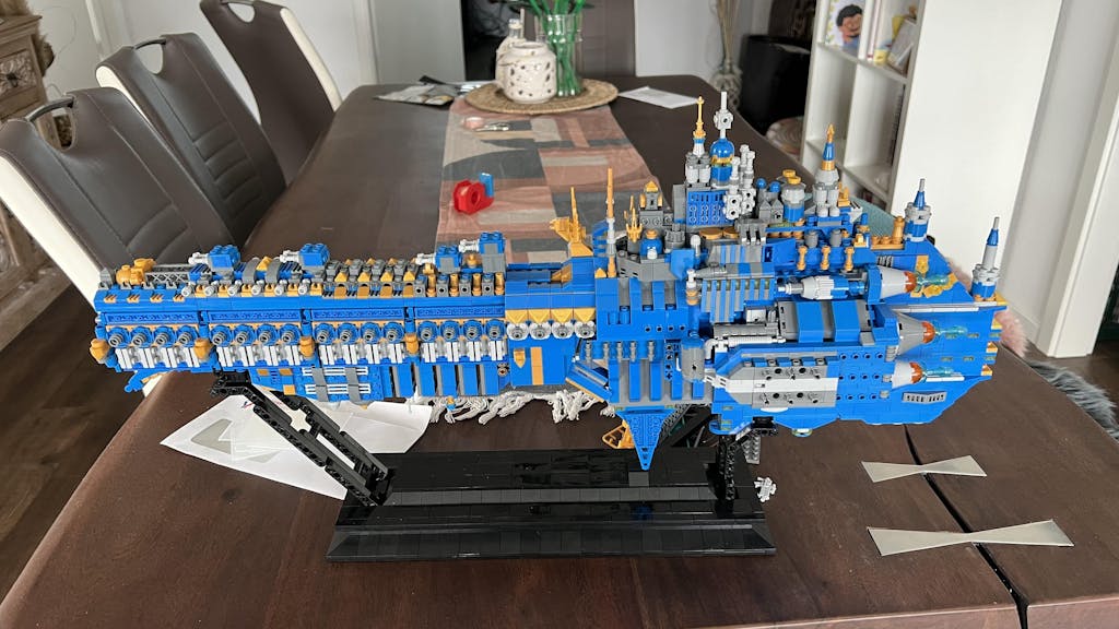 Background: Macragge's Honour is a massive spaceship from a famous sci-fi game, composed of 15 primary sub-models. Measures 81.4cm in length, 24cm in width, and 34.6cm in height, it accurately recreates numerous tiny details of the spaceship from the game. Extensive assembly testing has been performed, ensuring the entire model highly dependable.