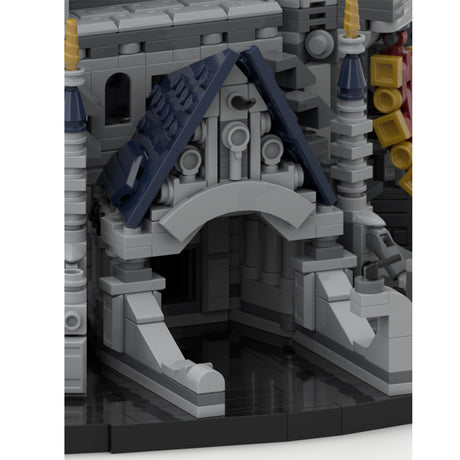 Sir Perceval built a castle with about 113,000 parts, standing on 28 32x32 baseplates. The castle was designed to be completely modular. It consists of 28 baseplate modules (A1 - G4) and 23 building modules (H01-H23). Each building is built separately and all floors are modularly removable and also have an interior.